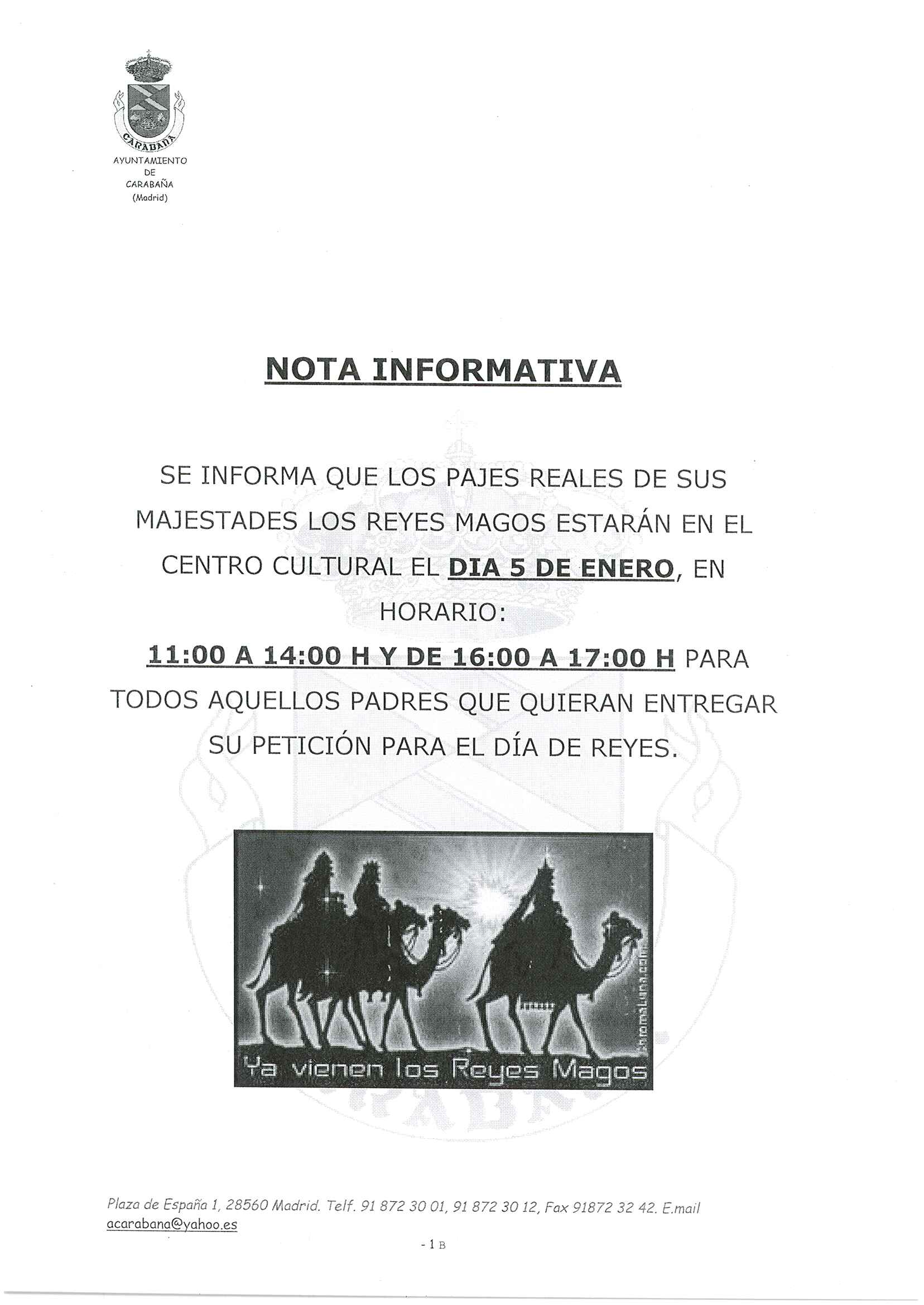 El día 5 de enero, estarán los Pajes Reales en el Centro Cultural, en horario de 11.00 a 14.00 y de 16.00 a 17.00 horas, para todos aquellos padres que quieran entregar su petición para el día de Reyes.